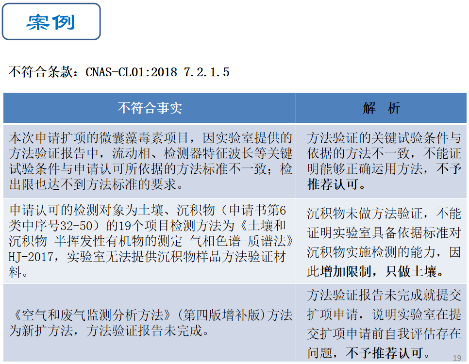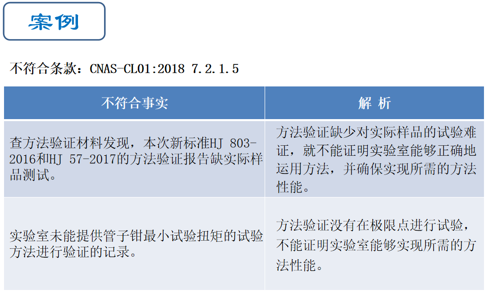 這2個(gè)不符合都是在進(jìn)行試驗(yàn)驗(yàn)證時(shí),在個(gè)別方面偏離了方法標(biāo)準(zhǔn)的要求。嚴(yán)格意義上說(shuō)這不算是對(duì)標(biāo)準(zhǔn)方法的驗(yàn)證,如果實(shí)驗(yàn)室打算長(zhǎng)期偏離標(biāo)準(zhǔn)方法操作,應(yīng)按非標(biāo)申請(qǐng)認(rèn)可,并做方法確認(rèn)。準(zhǔn)則的7.2.2.1規(guī)定,對(duì)修改的標(biāo)準(zhǔn)方法要進(jìn)行確認(rèn)。對(duì)標(biāo)準(zhǔn)方法的驗(yàn)證不應(yīng)該有偏離標(biāo)準(zhǔn)要求的情況出現(xiàn)。
