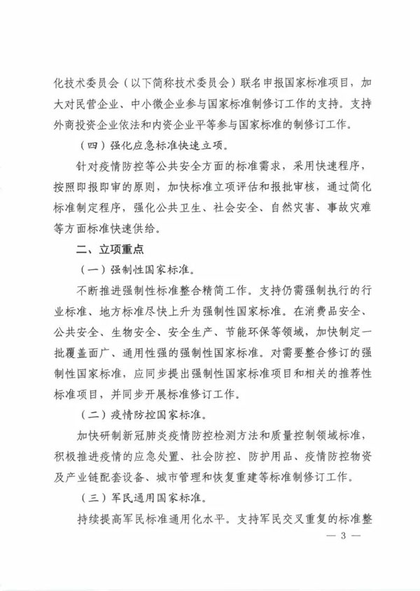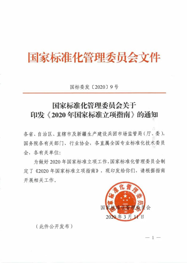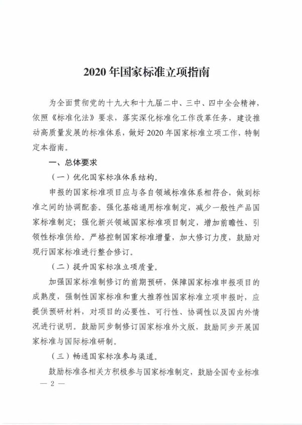近日,國家標準委發(fā)布《2020年國家標準立項指南》。根據《指南》,2020年國家標準立項重點包括強制性國家標準、疫情防控國家標準、軍民通用國家標準、國際標準轉化國家標準、重點領域國家標準、標準樣品、國家標準外文版。詳情如下: