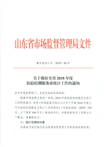關(guān)于做好全省2018年度檢驗(yàn)檢測服務(wù)業(yè)統(tǒng)計(jì)工作的通知(魯市監(jiān)科認(rèn)字[2019]80號)